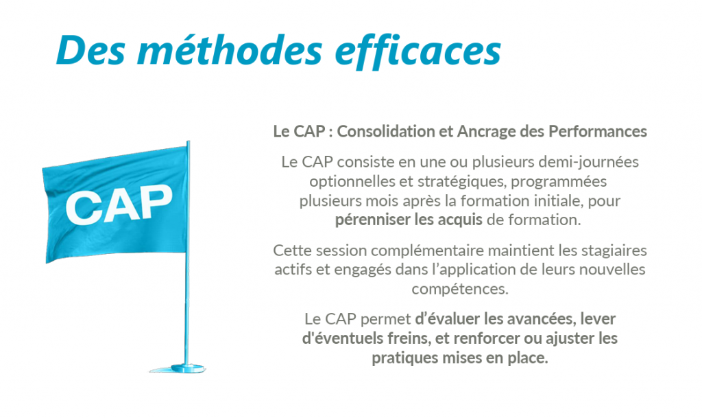 Grâce à une alternance de pédagogie interrogative, théorique (très peu) et applicative, nous accompagnons un développement des pratiques, avec des outils concrets pour une mise en œuvre immédiate.